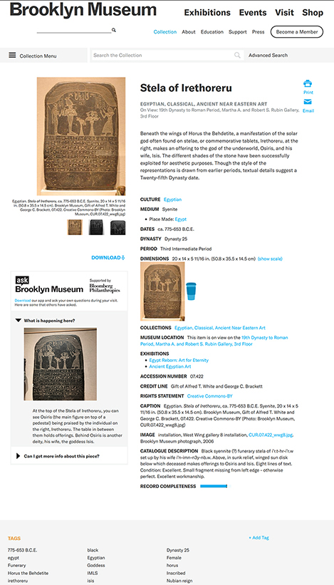 Fig. 2. Screenshot of Brooklyn Museum (Brooklyn, N.Y.) online collections record for the Stela of Irethoreru (Brooklyn Museum 07.422, acq. 1907) showing a travel mug as a visual scale and visitor-submitted questions and tags (Brooklyn Museum n.d.; digital image of object under CC BY 3.0 license; screenshot courtesy Brooklyn Museum).