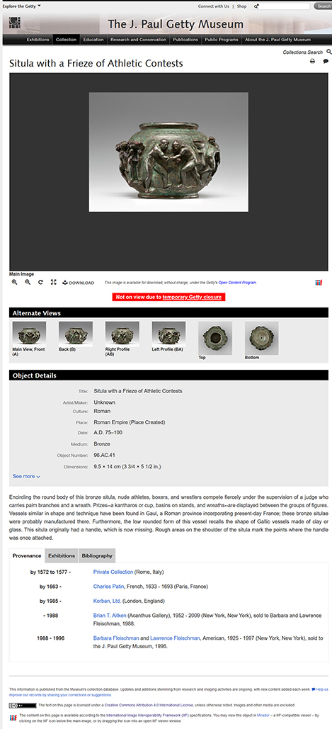 Fig. 3. Screenshot of J. Paul Getty Museum (Los Angeles) online collections record for the Situla with a Frieze of Athletic Contests (J. Paul Getty Museum 96.AC.41, acq. 1996; in private collection in Rome by ca. 1572–1577) showing provenance history, with links to groups of objects related through provenance (J. Paul Getty Museum n.d.; screenshot © J. Paul Getty Trust, use granted under CC BY-NC license, courtesy J. Paul Getty Trust; digital image and text content depicted in screenshot under CC BY 4.0 license, courtesy of the Getty’s Open Content Program).