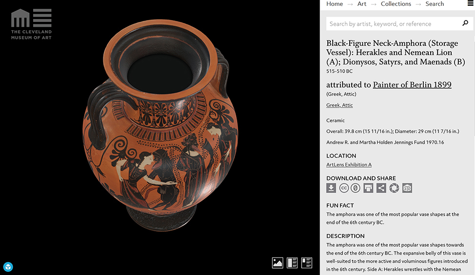 Fig. 4. Screenshot of Cleveland Museum of Art online collection record for “Black-Figure Neck-Amphora (Storage Vessel): Herakles and Nemean Lion (A); Dionysos, Satyrs, and Maenads (B)” (Cleveland Museum of Art 1970.16, acq. 1970) showing embedded digital 3D model (Cleveland Museum of Art n.d.[a]; digital 3D model under CC0 dedication: screenshot courtesy Cleveland Museum of Art).