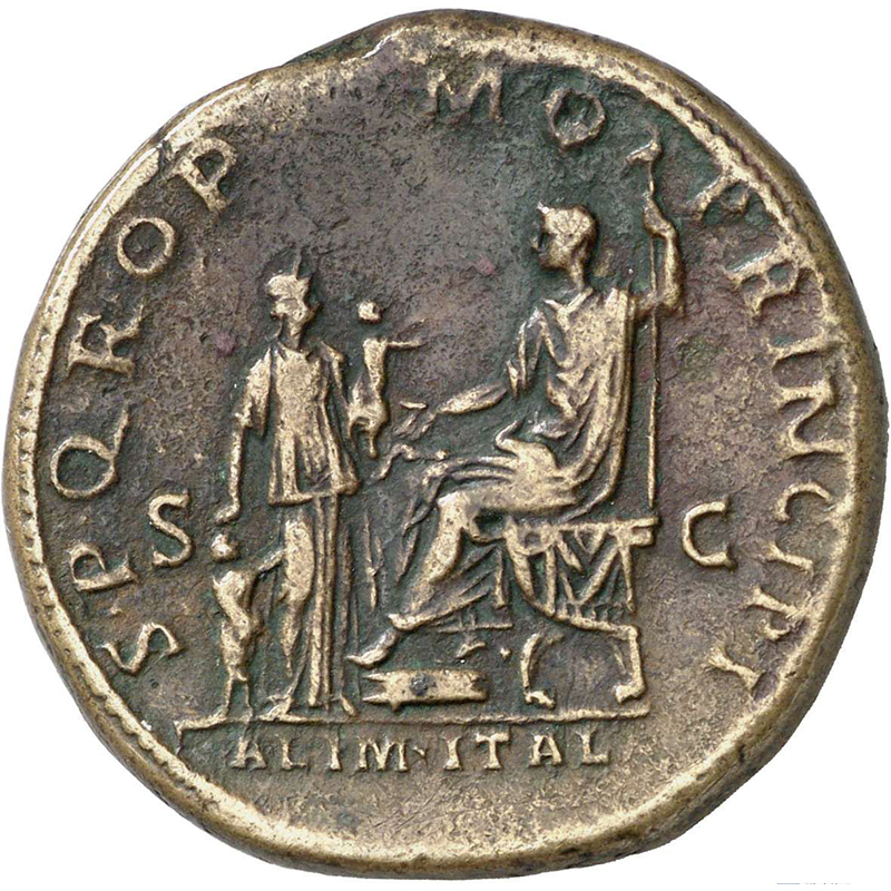 Reverse of bronze sestertius of Trajan (103–111 CE), Rome (RIC2 461). The emperor, seated on a curule chair holding a scepter, faces left and extends his hand toward a small child held by a female figure, commonly identified as Italia; a second child stands at her side. Berlin, Münzkabinett der Staatlichen Museen zu Berlin 18200254, acq. 1925 (Lutz-Jürgen Lübke [Lübke und Wiedemann]).