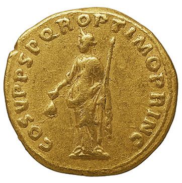 Aureus of Trajan, struck at Rome ca. 108–110 CE. Reverse: Libertas standing and holding a pilleus and vindicta, CO(N)S(VLI) V P(ATRI) P(ATRIAE) S(ENATVS) P(OPVLVS) Q(VE) R(OMANVS) OPTIMO PRINC(IPI) ([continuing titles from obverse] Consul for the Fifth Time, Father of the Fatherland, the Senate and Roman People to Best Prince). Paris, Bibliothèque nationale de France AF 506, acq. 1847 (© Bibliothèque nationale).