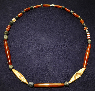 Much of this jewelry was fashioned of beads strung on now-missing organic materials, and their original arrangements have largely been lost. Excavators have often published finds of beads as reconstructed “necklaces” without articulating any rationale for the reconstructions, and these hypothetical reconstructions are perpetuated by scholars and museum displays. One such “necklace” is highlighted in the Mesopotamia case; it is a symmetrical grouping of beads typical of the late Early Dynastic period/Akkadian era and consisting of gold tubes, lapis lazuli in biconical and globular forms, long biconical carnelian tubes, etched and plain carnelian barrels, and carnelian lentoids etched with a white ring (fig. 2).10 Despite the persistent necklace reconstruction, parallels from Mohenjo Daro and possibly Ur suggest that these weighty carnelian tubes were used for hip and waist girdles rather than necklaces.11