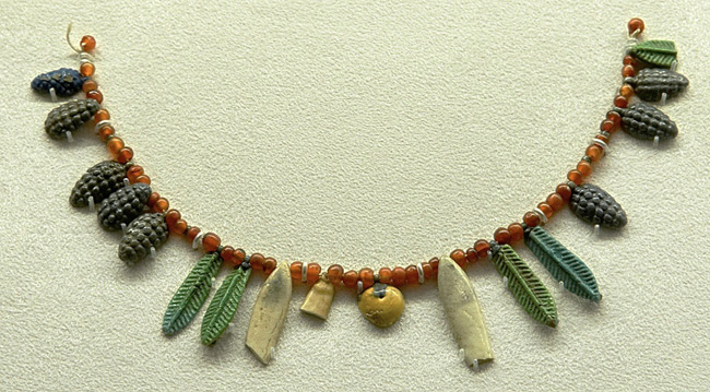 The Egyptian jewelry is drawn from the Field Museum’s own collections, and much of it was acquired on the market in preparation for the World’s Columbian Exposition of 1893. This case continues the focus on materials and iconography. Many of the objects displayed here are made of composite, vitreous materials such as faience; and in their variety, they illustrate the astonishing flexibility of this medium, both in its ability to be shaped and in the range of possible colors, which allowed it to serve as an inexpensive substitute for precious stones. The objects include a group of beads representing different plant forms: for example, deep blue grape bunches and bright green palm fronds (fig. 3). While these vegetal pendants are strung together as a simple necklace, they almost certainly were elements in openwork, multirowed collars of a type known in the later 18th Dynasty, particularly during the Amarna period.27