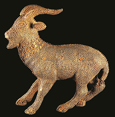 The most dazzling and technologically sophisticated objects in the exhibition are found in the case dedicated to the Islamic world. The objects date, according to the case labels, to the eighth to 16th centuries and are attributed to the Levant, Mesopotamia, and Iran. A small gold figurine of a goat provides a lovely example of the Islamic dialogue between natural forms, three-dimensional volume, and surface patterning (fig. 4).30 The animal’s naturalistically formed body is encrusted with a reticulated pattern created by the application to the surface of loops of twisted wire in the shape of overlapping “scales” and the use of twisted wire and rows of granules to define contours. Embedded in the design of the filigree on the animal’s flank are silhouettes of three horned animals, which are outlined in twisted gold wire and filled with delicate granulation. While it is not clear whether the figurine can stand on its own four hooves, and there is no visible attachment point or loop for suspension, it may have been an element in a precious sculptural group such as the one presented to the ninth-century C.E. Caliph al-Mutawakkil, according to the medieval Islamic writer Ibn al-Zubayr.