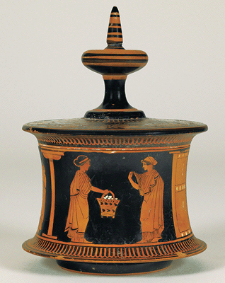 The Heroines pyxis in the British Museum is a fifth-century B.C.E. Attic red-figure vase that is attributed to a follower of Douris and appears at first glance to depict a generic scene of women’s life. The scene, however, is transformed by the artist’s use of inscriptions that give the names of mythological heroines to almost all the figures: Helen, Klytaimnestra, Kassandra, Iphigeneia, and Danae. Scholars have found the subject difficult to interpret because these women do not appear together in any one known story. This article argues that the vase painter meaningfully paired the women to prompt viewers to compare and contrast them in the same way that the tradition of Greek catalogue poetry does. The inscriptions name legendary women who would have evoked stories that reflect a range of ideals and ideas about Greek womanhood. The heroines resonate with one another in deliberate juxtapositions, articulating paradigms of womanhood that reveal the self-fashioning of contemporary aristocratic Athenian women. The pyxis expands our way of looking at Greek vases by suggesting that the inscriptions are not mere labels that clarify a scene, but cues that can create layers of complexity and meaning.