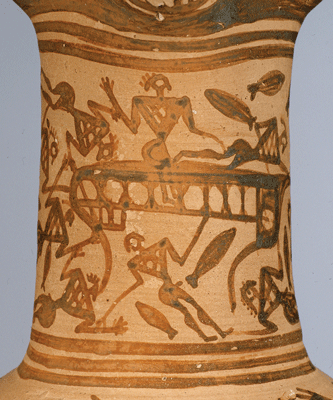 The once-popular interpretation of a well-known scene on a Late Geometric oinochoe in Munich as the shipwreck of Odysseus is now regularly dismissed: like other ambiguous scenes of late eighth-century art, it has been banished from the ranks of early mythological narratives. This article proposes that the scene be restored to the ranks of possible mythological images and defends the premise that myth was the subject of some Late Geometric artists. It also suggests that the most important thing we can do with a Late Geometric scene is not to assign it to one of the standard categories of “myth” (Sagenbild), “genre” (Lebensbild), or “the generalized heroic” but to new categories that transcend those distinctions. Images may be defined as “strong” or “weak” depending on their uniqueness, complexity, and especially the concreteness of description, whether they depict scenes of myth, genre, or real (as opposed to universalized) life—a subject that may be more common and significant than is usually thought. This approach emphasizes the exceptionalism, variety, and originality of Late Geometric imagery, and the Late Geometric artistís interest in the description of both the heroic and real worlds.