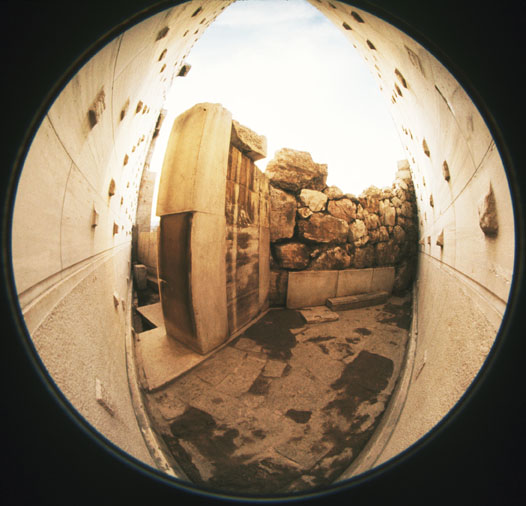 Fish-eye photograph of the surviving remains of the pre-Mnesiklean entrance, showing only the area lying between the southwest wing and the central core of the Propylaea. The parastas wall is center left; reused metopes from the Hekatompedon are center right. Note the fallen block from the Propylaea atop the parastas wall.