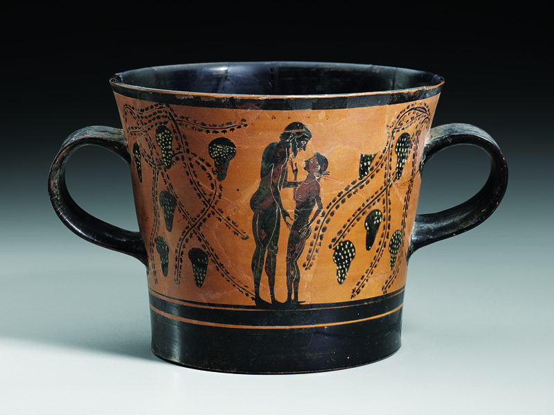 Attic black-figure two-handled cup of unusual shape, depicting a man courting a boy in a vineyard, ca. 520 B.C.E., ht. 0.114 m. Boston, Museum of Fine Arts, gift of Edward Perry and Fiske Warren, inv. no. 08.292 (© Museum of Fine Arts, Boston).