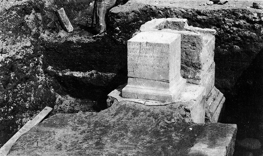 In this article, we present a reexamination of a shrine to Mercury preserved in situ in the basement of the apartment building at Via San Martino ai Monti 8, part of the ancient Clivus Suburanus, on the Esquiline Hill in Rome. A new campaign of documentation has yielded many new insights about the character, chronological development, and historical importance of this local shrine. We analyze the date and appearance of the republican shrine and consider the extensive changes that Augustus made when he restored it with money donated to him by the people of Rome on 1 January 10 B.C.E. The original interpretation of the monument as a compital shrine made after its excavation in 1888 is no longer tenable; rather, the monument is our only in situ example of an Augustan New Year’s dedication. The new analysis of the archaeological evidence for this particular shrine, considered within the broader context of other known examples of Augustus’ New Year’s monuments, not only highlights its unique aspects but also demonstrates what Augustus’ intentions for these monuments were and the dynamics of imperial interaction at such a local level. It provides a much better understanding of a distinctly Augustan group of monuments than does the literary evidence alone.