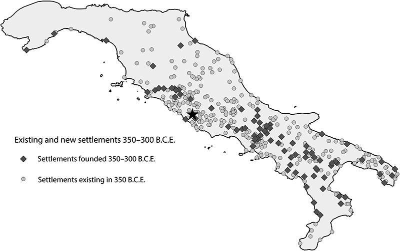 The article presents and discusses the results, relevant to the period 350–300 B.C.E., from an interrogation of a new archaeological database containing 583 (proto)urban centers (≥2 ha) of the Italian peninsula. Quantitative and geospatial analyses of site numbers, dated fortifications, and instances of regularized town planning reveal that the Early Hellenistic period was the most dynamic period of peninsular settlement growth in classical antiquity. Analyzing settlement patterns at the peninsular level counterbalances the strong regionalism of existing studies. Although there is already awareness of the processes described, here they are defined at the peninsular level for the first time, quantitatively and geographically, thus providing a reference for future research. This article also considers the challenges presented by the stark variances in the sources, quality, and quantity of data relevant to the archaeological sites. The project’s research design and methodology is described. A preliminary discussion on the causes of this settlement growth assesses existing regional explanations. Known contemporary supraregional processes are also discussed, including the rise in the number of rural sites and the Roman conquest. It is suggested that the vibrancy of major settlements might be linked with novel agricultural strategies or systems of landholding, and possible directions for future research are proposed.
