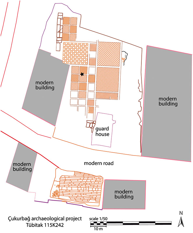 Fig. 6. Map of the Çukurbağ archaeological site. The star indicates the findspot of the relief block with the embracing emperors. The monumental stairs are south of the modern road, between two modern buildings (courtesy Çukurbağ Archaeological Project [TÜBİTAK 115K242]).