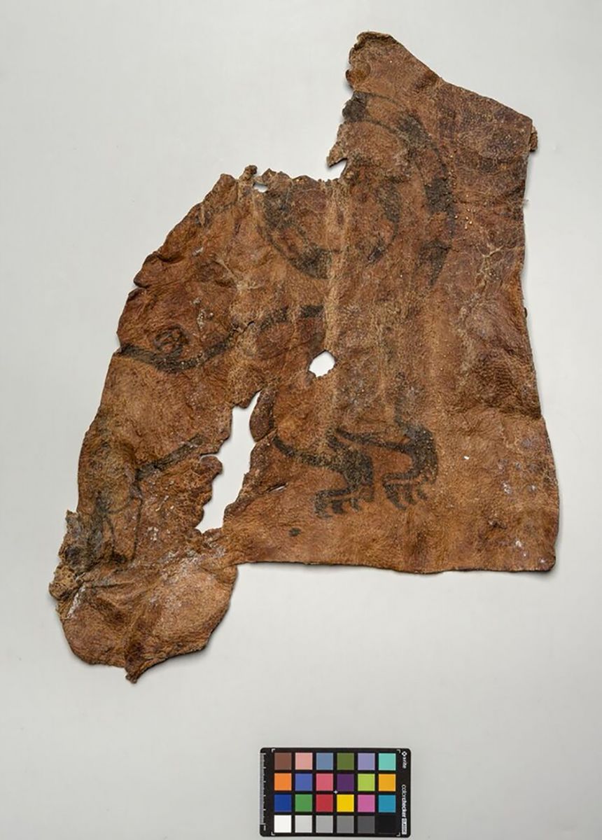 Moving from the abstract and depersonalized notion of the individual, visitors next encounter how the Scythians personalized their appearance. Many visitors will be drawn to the gold items recovered from numerous burial mounds, but this part of the exhibition represents a less well-known aspect of Scythian lifeways: tattooing and dress. Perhaps the most fascinating part of the whole exhibition is the tattooed skin from individuals recovered from the Pazyryk burials from the Tuva region of the Siberian steppe (fig. 5). The Pazyryk individuals were buried in wood coffins under mounds of stones in the steppe permafrost on the Ukok Plateau of the Altai Mountains.9 The permafrost preserved the bodies through time, including organic material such as hair, skin, leather, rugs, clothing, and wooden implements and furniture (e.g., stools). While human skin may seem a macabre item to put in an exhibition, or at the very least evoke images of the famous Amazonian rainforest shrunken heads, the tattoos of the male (chief) and female (wife of the chief, or as labeled in the exhibition, “chief’s consort”) of Pazyryk allow yet another glimpse into how the Scythians perceived and experienced their world. These images depict how human life was intertwined with the animal world, be it real or mythic.