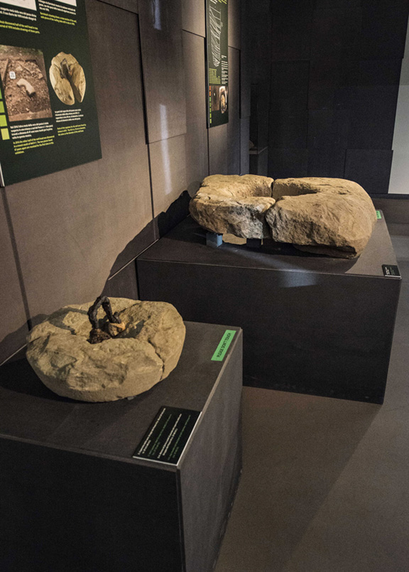 The first fragment was recovered in 1970 upon the initial archaeological investigation of one of the wells. The joining fragment that completed the well cover was not recovered until 2016. This portion of the display elegantly characterizes the myriad ways in which archaeological research and discovery is always a process of incremental observation, built on generations of inquiry, a characteristic of our work that is often far removed from the popular imagination.