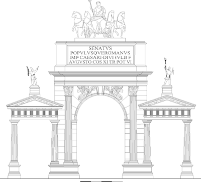 Reconstruction of Parthian Arch in the Roman Forum (Elevation of the arch by Gamberini-Mongenet; statuary group by G. Gatti after Kleiner 1985, pls. 4.3, 5.2, with modifications by J. Wallrodt).