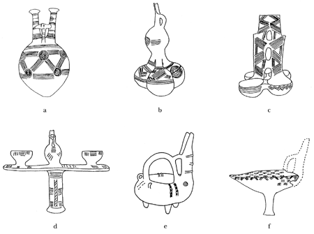 Drawings of diverse Red Polished cult or ceremonial vessels from Bellapais Vounous, site B, on Cyprus. The excavation of cemeteries at Bellapais Vounous has revealed much about EarlyñMiddle Cypriot Bronze age funerary ritual and social structure. (After Morris 1985, figs. 8, 57, 70, 97, 3; Dunn-Vaturi 2003, pl. 3, respectively)