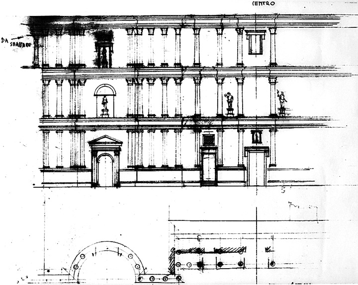 The essays in this catalogue are an impressive collection of Gismondi materials, richly illustrated with drawings and photographs of the reconstructed buildings and models. And yet much has been omitted. For Ostia alone, the superintendency could mount an entire show from Gismondi’s working drawings and photographs in the archives at Ostia showing excavation and reassembly of the structures he restored. Contemporary on-site photographs could indicate the present state of the site. Moreover, since the materials presented here are drawn only from the archives of the Archaeological Superintendency, they omit most of Gismondi’s output for the city of Rome. Missing are his spectacular reconstructions of the Forum of Augustus1 and the Forum of Trajan.2 The model of imperial Rome in the age of Constantine (presently in the Museum of Roman Civilization; see below) is also sparsely treated. Photographs of the model and corresponding reproductions of Gismondi’s drawings, now in the museum’s archive (Archivio Storico del Museo della Civiltà Romana), and analyses of the sources he used for them could show how he worked. His designs for the model’s Theater of Pompey (figs. 1, 2 herein) reveal that, at least for the theater, he made only general plans (based mostly on those of Canina and Lanciani). Then, in response to specific questions from Pierino Di Carlo, the model maker, he executed detailed sketches.