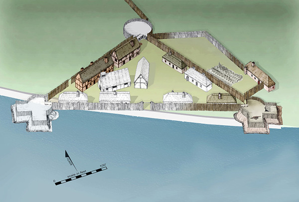![Fig. 2. Artist's reconstruction of Fort James, ca. 1611, based on archaeological excavations and documentary history (lgth. of river side 128.016 m [140 yards]; lgth. of east side 91.44 m [100 yards]; lgth. of west side 91.44 m [100 yards]) (courtesy APVA Preservation Virginia).](jpg/1124_sanford02.jpg)