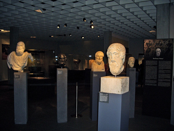 The installation, spread out over two floors of galleries on the lower level of the Antikenmuseum, is organized around four overarching themes: Homer and his time (i.e., the late eighth and early seventh centuries B.C.E., when the poet we call Homer is thought to have lived and worked); the “prehistory of Homeric poetry” (i.e., the Mycenaean period of the later second millennium B.C.E., when the epic poems are ostensibly set); Homer’s Iliad and Odyssey; and the transmission and influence of Homeric epic from Roman times to the present. Entering the show, the visitor is immediately confronted by a phalanx of imaginary portraits of the blind poet Homer (fig. 1), mainly in busts and reliefs but also on coins. Here, one of the premises of the show is announced at the outset: in its desire to educate and inform, the exhibition mixes and juxtaposes every kind of object with democratic abandon. Antiquities are not privileged over derivative later works (e.g., a Wedgwood bust of Homer)4 or originals over reproductions. When objects deemed essential for the didactic aims of the show could not be obtained (e.g., the Dipylon jug in Athens,5 the Apotheosis of Homer relief in the British Museum,6 the Hoby cups in Copenhagen,7 sculptures from Sperlonga8), modern reproductions have been substituted. Since many equally famous pieces are here in the original, one needs to read the labels carefully, but that is clearly not the point. Large photograph murals on nearly every wall complement the objects, creating almost a sensory overload of experience, though never really distracting from the carefully grouped and brilliantly lighted works of art.