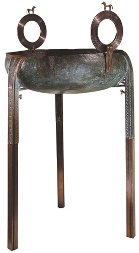 The show, of course, draws heavily on the astonishing riches of its host institution, Basel’s Antikenmuseum and Ludwig Collection, which is unique for building in a mere 50 years an encyclopedic collection that rivals the depth and quality of much older museums in Europe and North America. These are supplemented with international loans, all chosen with great care and thoughtfulness for artistic quality and educational value, drawn from more than 80 museums and collections throughout Europe. For example, a relatively small gallery devoted to artifacts of the eighth century B.C.E. (“Homer’s time”) and the Orientalizing period of the seventh century includes two astonishing works from the museums in Basel and Karlsruhe. This allows a comparison between the Geometric-style bronze tripod cauldron of the eighth century (fig. 2)9—in which the three legs and bowl are fused into a single object—and the orientalizing model of a century later, with its separately worked, deep bowl; ornamented rim with three protomes of winged bulls’ heads; and elaborate three-legged stand with bulls’ hoofs for feet.10 The Geometric tripod has been restored, with the addition of the lower legs and the two large, round handles, each topped by a small horse, in order to give the full effect of these impressive monuments that have been found in large numbers at Olympia. An unusual feature that does survive consists of the small bulls’ heads attached to the insides of the legs, just below the join of legs to cauldron. This element had previously been attested only for the very earliest of such objects, dating to the ninth century, while the Basel example is dated to the mid eighth.11 Along with the tripod cauldrons, there are a few choice Late Geometric vases and bronze horses, Nimrud ivories, an Urartian helmet, Phoenician silver bowls and a tridacna shell, early Etruscan bucchero, and a remarkable late eighth-century tomb complex from Eretria (iron sword and seal, bronze bowl). In short, these objects—some imported from the East, some made in Greece itself—provide a crash course in the explosion of artistic creativity that engulfed the Greek world in the century after the end of the Dark Ages.12