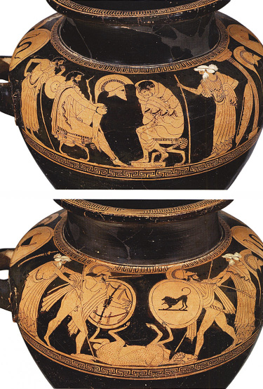 If, as Peter Blome tentatively suggests in the catalogue entry, the two warriors should be Achilles and Hektor after the death of Patroklos at the hands of Hektor, the scene on the reverse represents a direct response to the embassy on the other side of the vase. Whereas during the embassy, nothing could induce Achilles to rejoin the battle (symbolized by his abstracted pose and refusal to engage with Odysseus who sits opposite him), he has now done precisely that, moved to action by the death of his friend Patroklos. We need to turn to the catalogue for good juxtaposed images of the two sides of the stamnos, but elsewhere the catalogue inexplicably omits illustrations of the reverse of some vases, even when they pertain to the Homeric theme.37 At times like this, the Basel show seems to be an art exhibition designed by a philologist.