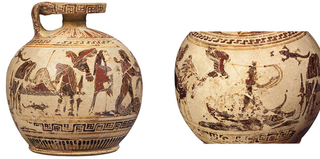 The section on the Odyssey has, if anything, an even more shockingly miscellaneous assortment of objects than that on the Iliad, from the Late Geometric oinochoe with (perhaps) the shipwrecked Odysseus38 to Böcklin’s bizarrely droll take on the Sirens (1875).39 An exhibition highlight is the remarkable Corinthian aryballos of ca. 590 B.C.E., with a very early and somewhat problematic version of the Sirens episode (fig. 5); it is also one of the treasures of Basel’s own vase collection.40 Here, the principal scene—Herakles and Iolaos fighting the Hydra under the watchful eye of Athena—takes up most of the surface of the vase, while the Odyssey scene is relegated to the handle zone. The narrative continuity of these two seemingly unrelated pictures is difficult to explain: the one unmistakable Siren, hovering behind Athena, is placed far from the ship of Odysseus, while a menagerie of other creatures—two lizards, an owl, and a large bird that does not appear to be a Siren—is scattered over the vase. Amyx was not convinced of the interpretation,41 though the towering figure astride the ship’s mast who gestures with his arms could hardly be anyone other than Odysseus.