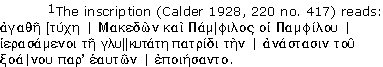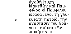 Inscriptions should be marked according to the Leiden system, as outlined in The Study of Greek Inscriptions, 2nd ed. (A.G. Woodhead [Cambridge 1981] 6–11) and Conventions in Editing: A Suggested Reformulation of the Leiden System (S. Dow [Durham 1969]). Inscriptions quoted within the text should be written with a division of lines corresponding to those on the stone, with every fifth line numbered: