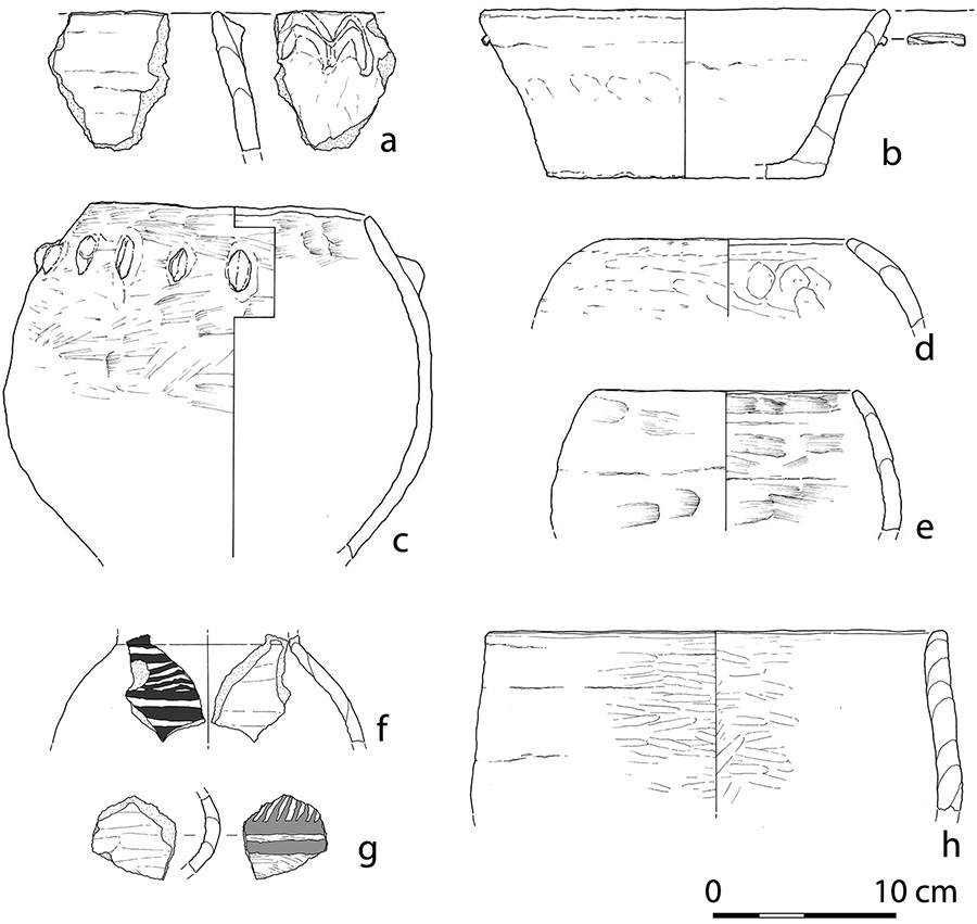 Pottery from Göytepe (a–e) and Hacı Elamxanlı Tepe (f–h). Parts a (level 5), c, and e (level 11) are mineral-tempered ware; parts b (level 5) and d (level 6) are plant-tempered ware; parts f (level 3) and g (level 2) are painted fine ware; part h (level 3) is plant-tempered ware.