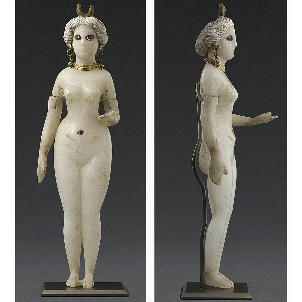 This article presents a new evaluation of alabaster figurines wearing crescent crowns, identified as the syncretized deity Ishtar-Aphrodite, from the Seleucid-Parthian period in Babylonia (ca. second century BCE–first century CE). Unlike previous studies, this article recontextualizes the alabaster goddesses as the most opulent and explicitly divine versions of two popular types in the broader, flourishing figurine tradition of Hellenistic Babylonia. Miniaturization theory, which elucidates the sensory and perceptual effects of small-scale objects, forms the methodological basis of this analysis, in dialogue with archaeological data and textual sources from Mesopotamia and the wider Hellenistic world. Using this approach, I argue that these figurines were open to identification as both goddesses and mortals so that a girl or woman could use them to construct her own sexual agency and facilitate her journey to the afterlife, even as she invoked the goddess’ assistance with both. The few unambiguous goddess figurines were depicted with crescent crowns to link their elite owners to the Babylonian temples and their prestigious astrological knowledge. This article makes the contribution of articulating the significant intertwining of Greek and Babylonian cultural values and religious beliefs that shaped these figurines, which were hybrid in more than just style.